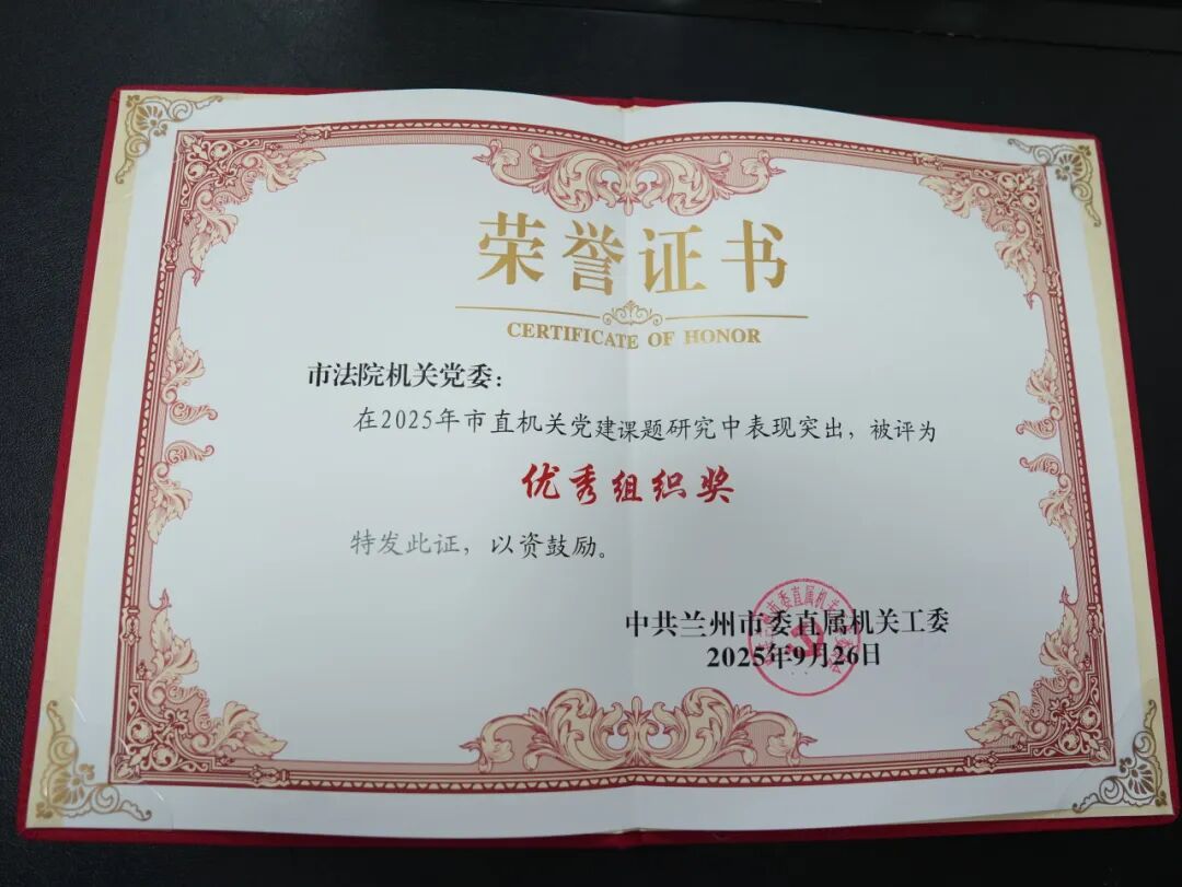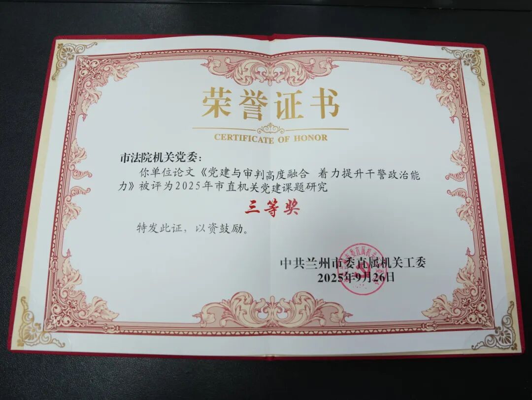 近日,兰州中院报送的《党建与审判高度融合 着力提升干警政治能力》,在市委直属机关工委组织的2025年市直机关党建课题研究评选中,荣获三等奖,兰州中院机关党委被评为“2025年市直机关党建课题研究优秀组织奖”。