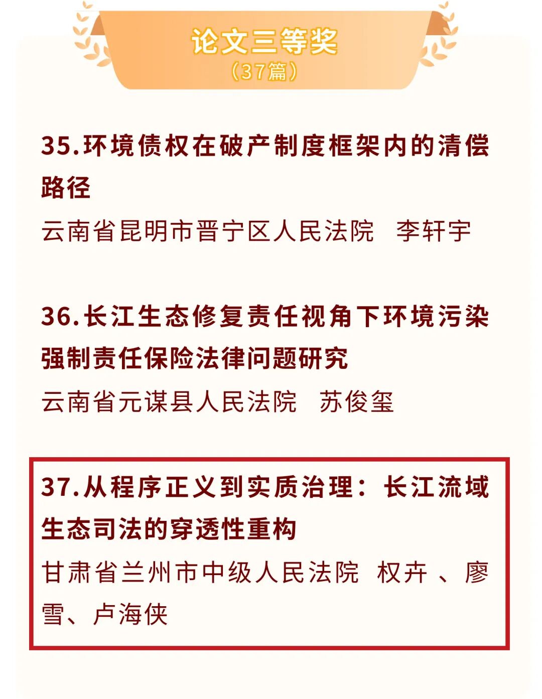 日前,第四届长江大保护司法论坛主题征文评选活动圆满结束。本次征文活动共收到论文327篇,调研报告12篇,案例分析23篇。评出论文一等奖11篇、二等奖25篇、三等奖37篇、优秀奖49篇,合计122篇;优秀调研报告3篇;优秀案例分析3篇。其中,兰州中院1篇论文荣获论文三等奖。