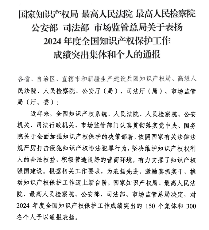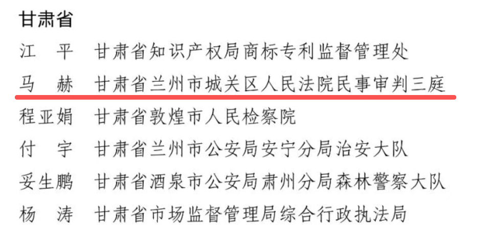 近日,国家知识产权局、最高人民法院、最高人民检察院、公安部、司法部、国家市场监督管理总局联合印发《关于表扬2024年度全国知识产权保护工作成绩突出集体和个人的通报》,对在全国知识产权保护工作中表现突出的集体和个人予以通报表扬。其中,甘肃省兰州市城关区人民法院民事审判三庭法官马赫,获评“2024年度知识产权保护工作成绩突出个人”。