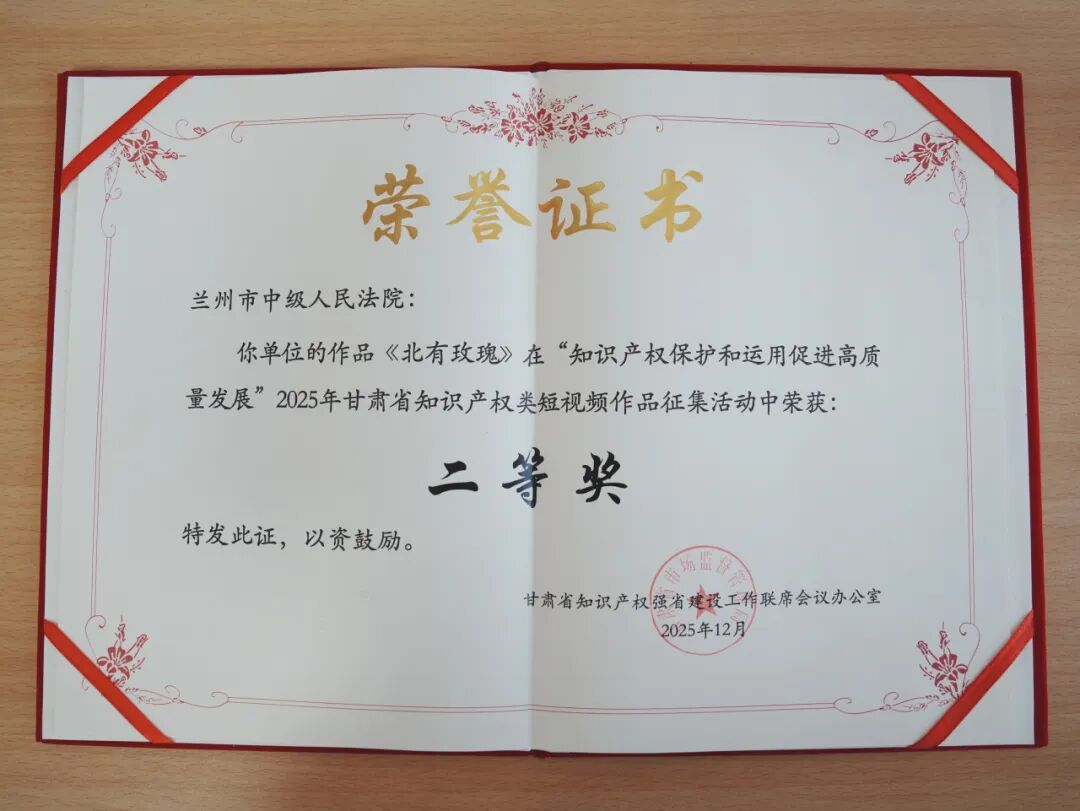 12月24日,甘肃省知识产权强省建设工作联席会议办公室主办的2025年甘肃省知识产权类短视频作品征集活动颁奖仪式在兰州宁卧庄宾馆隆重举行,此次征集活动共评选出一等奖3个、二等奖5个、三等奖7个、优秀奖5个、组织奖7个,其中,兰州市中级人民法院制作的《北有玫瑰》短视频作品荣获二等奖。