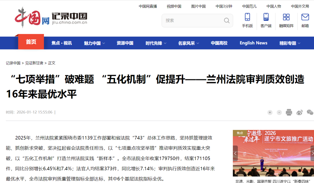 2025年,兰州法院紧紧围绕市委1139工作部署和省法院“743”总体工作思路,坚持抓管理提效能、抓创新求突破,坚决扛起省会法院责任担当,以“七项重点攻坚举措”推动审判质效实现重大突破,以“五化工作机制”打造兰州法院实践“新样本”。