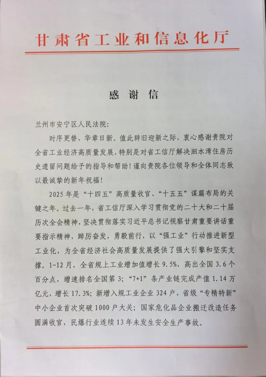 一纸薄笺,重逾千钧。2026年1月30日,甘肃省工业和信息化厅专程向安宁区法院发来感谢信,字里行间满溢对法院倾力化解安宁区洄水湾基建项目长达十二年历史积怨的崇高敬意与诚挚谢忱。这封承载着沉甸甸信任的信件,不仅是对安宁区法院工作的高度肯定,更是对司法力量守护发展大局、破解民生难题的生动礼赞。