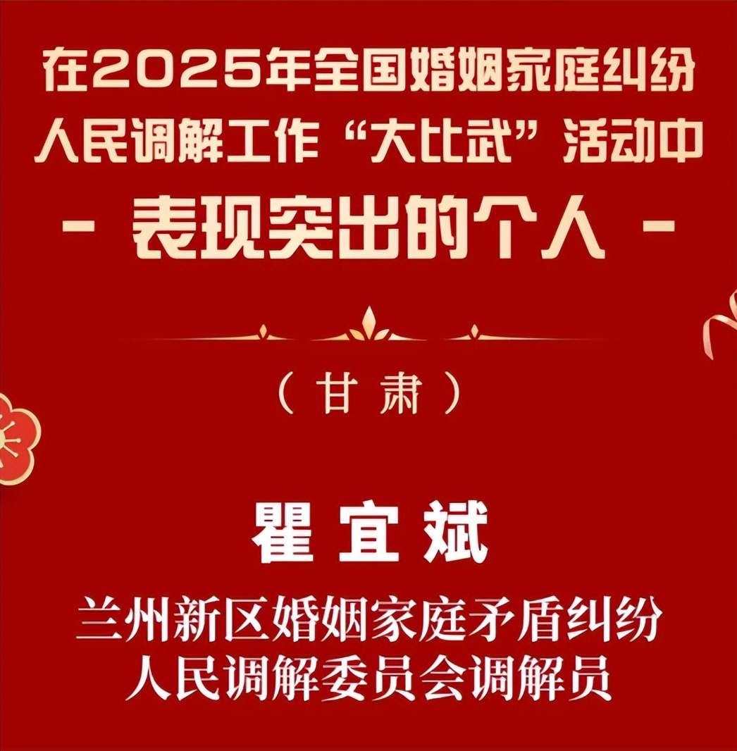 近日,司法部与全国妇联联合印发《关于表扬在2025年全国婚姻家庭纠纷人民调解工作“大比武”活动中表现突出的个人和集体的决定》。在此次通报表扬中,全国共有96名个人和20个集体上榜。其中,甘肃省有3名个人上榜,来自兰州新区婚姻家庭矛盾纠纷人民调解委员会的调解员瞿宜斌名列其中。